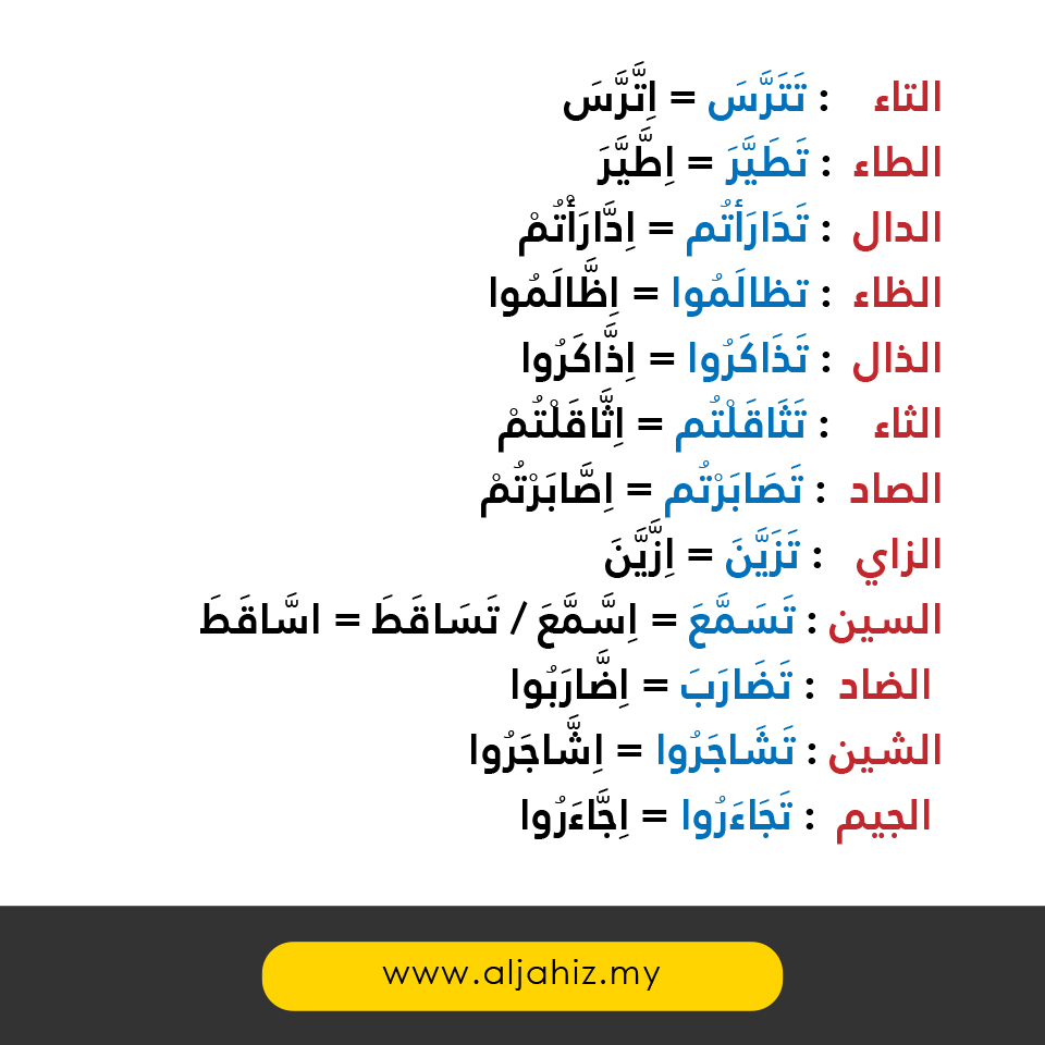 Contohnya تَطَيَّرَ akan menjadi اِطَّيَّرَ.